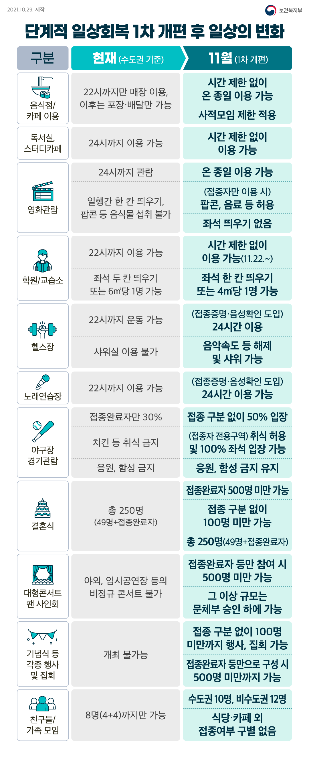 11월부터 단계적 일상생활이 회복됩니다. 빨리 코로나가 종식되고 마스크 없이 자유롭게 다니고 싶네요.