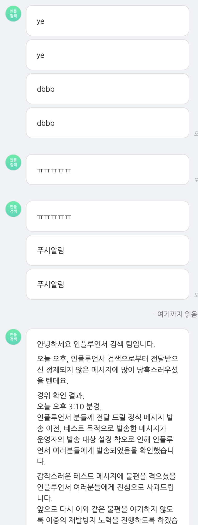 운영자의 발송 대상 설정 착오로 인해 인플루언서 여러분들에게 발송되었음을 확인했습니다.갑작스러운 테스트 메시지에 불편을 겪으셨을 인플루언서 여러분들에게 진심으로 사과드립니다.