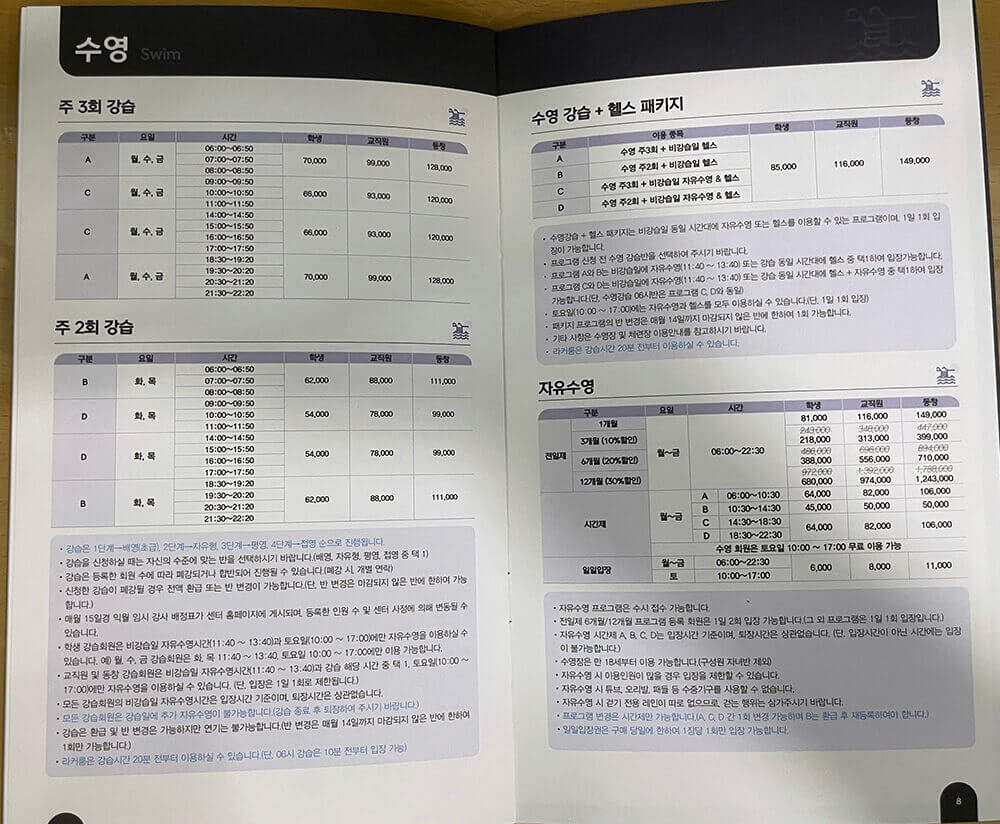 수영강습의 경우 헬스와 같이 패키지로 하실 수도 있습니다.