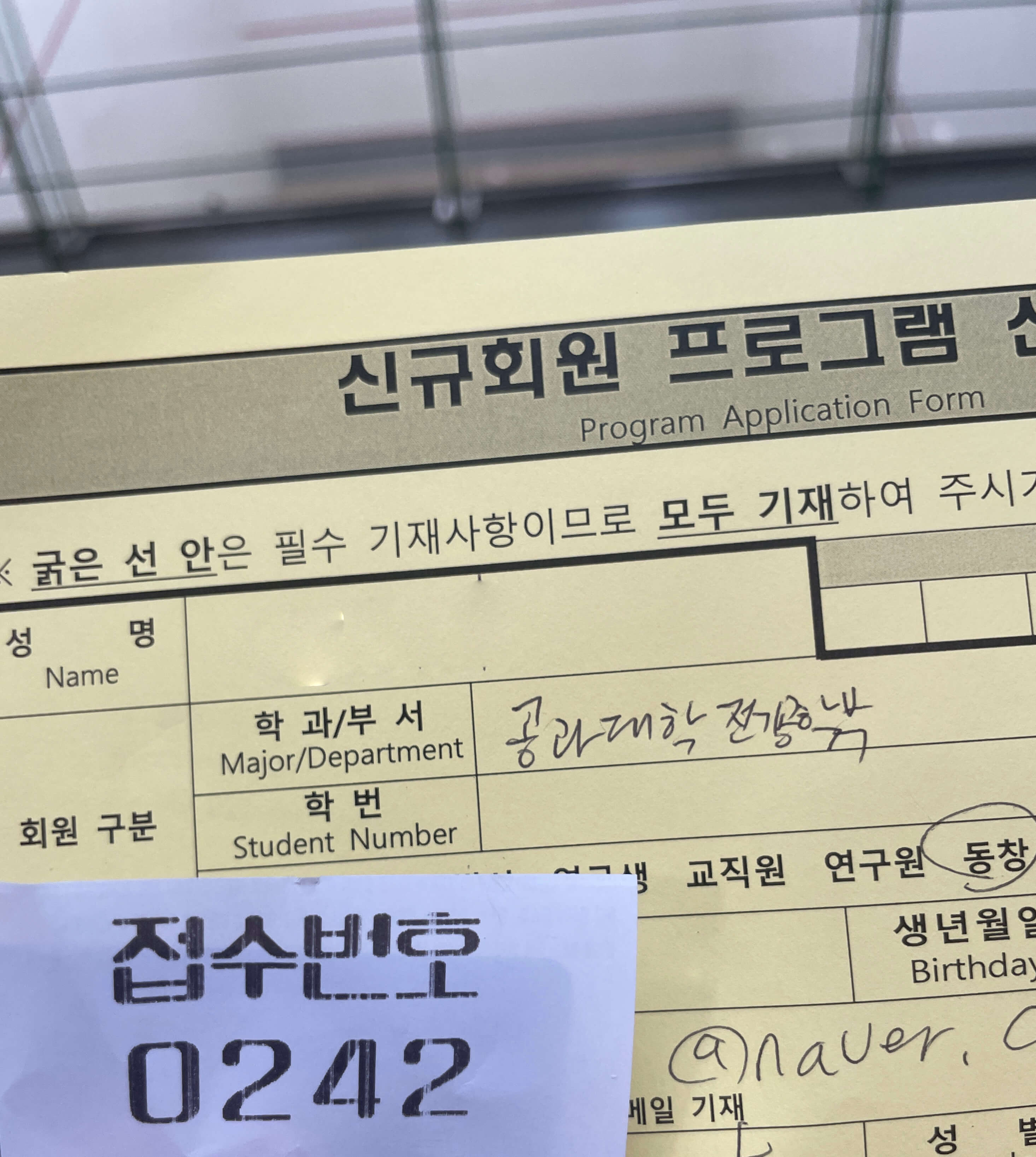 1층 안내데스크에서 번호표를 먼저 뽑고, 신규회원 프로그램 신청서를 적으면 됩니다.