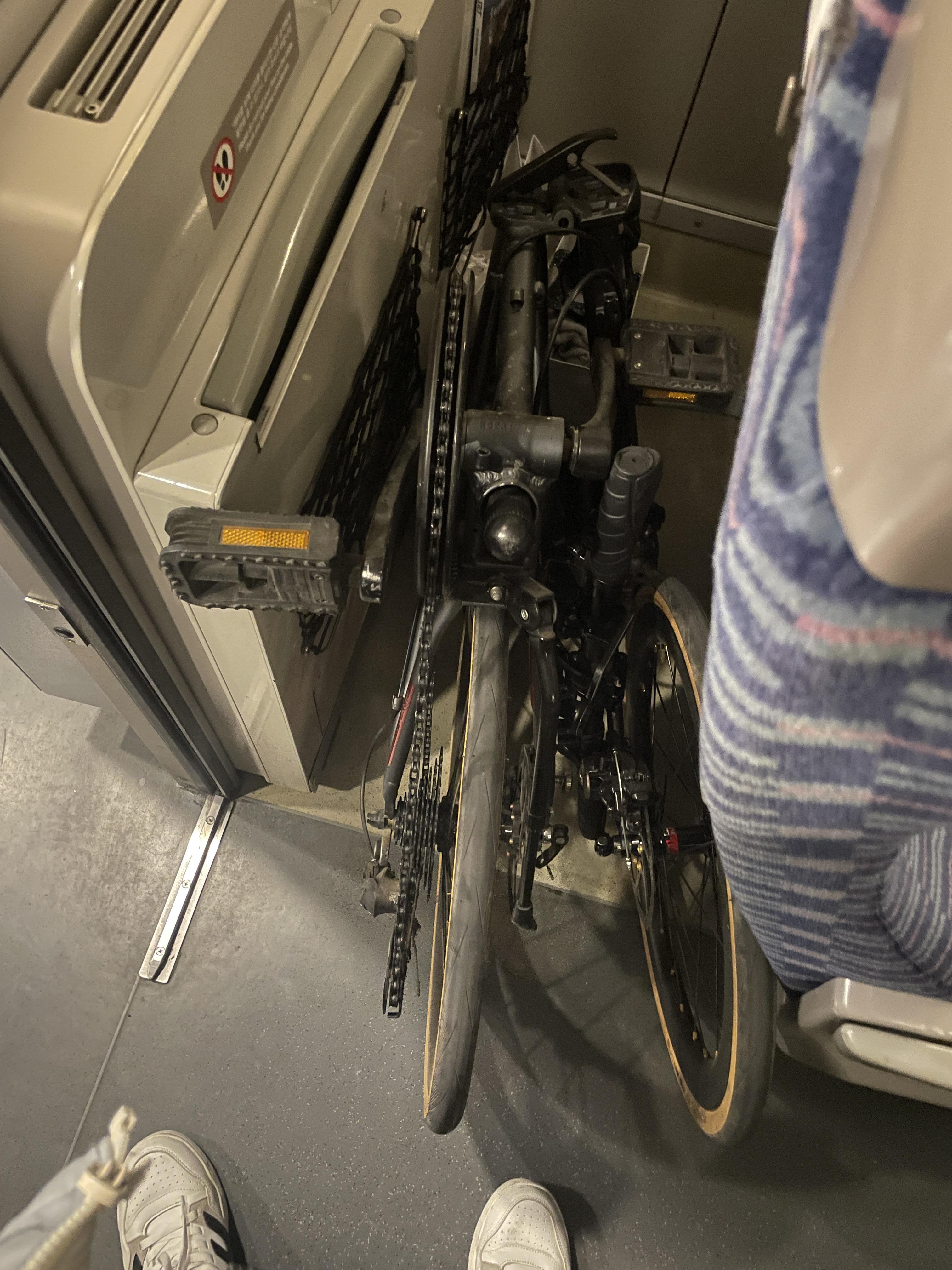 자전거가 통로로 삐죽나와 체인이 노출되었습니다.