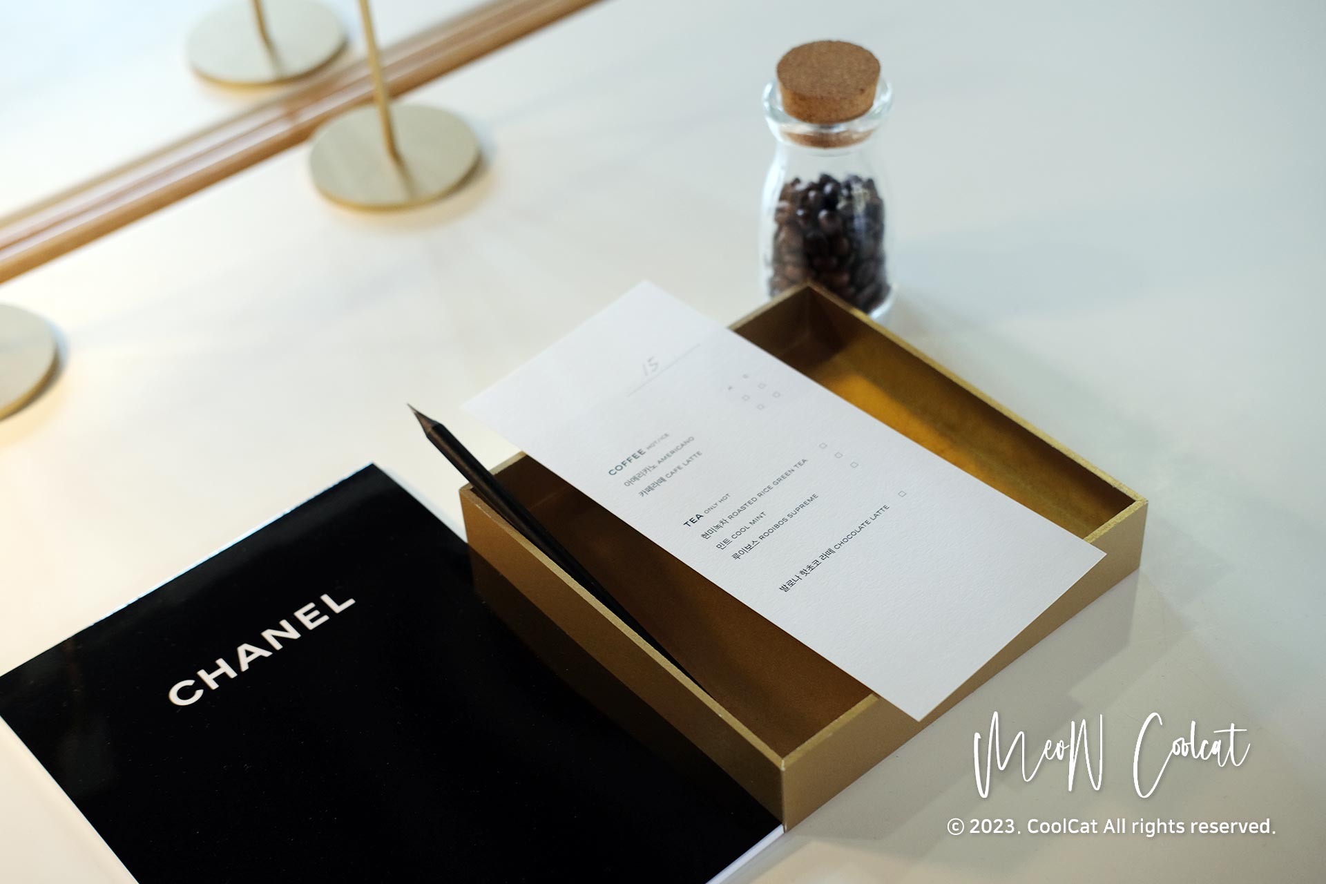 샤넬 조향클래스 세팅으로 노트세트, 음료 메뉴가 있었어요.