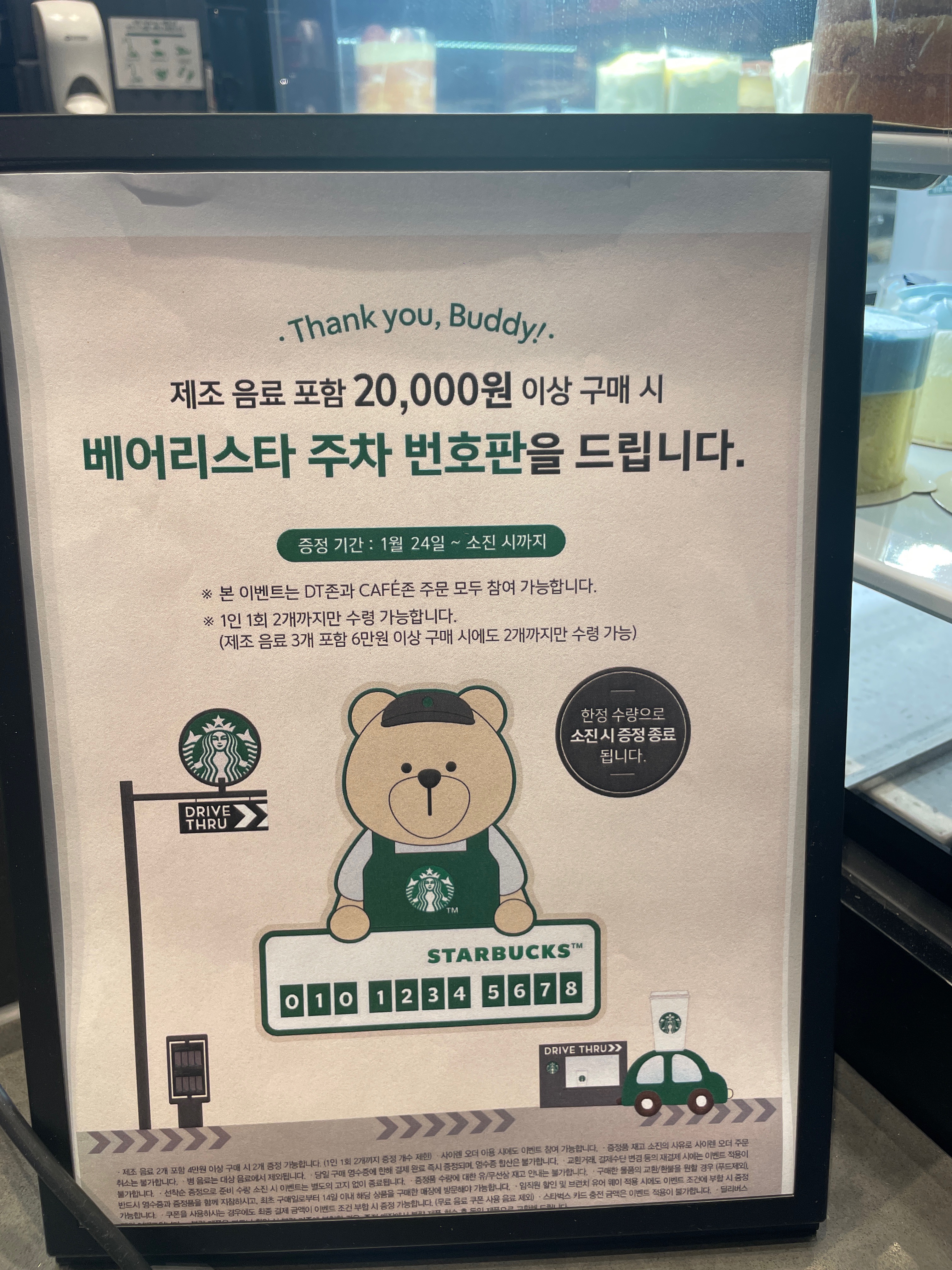 4만원이 넘어도 제조음료가 1개면 베어리스타 주차 번호판은 1개가 증정된다.